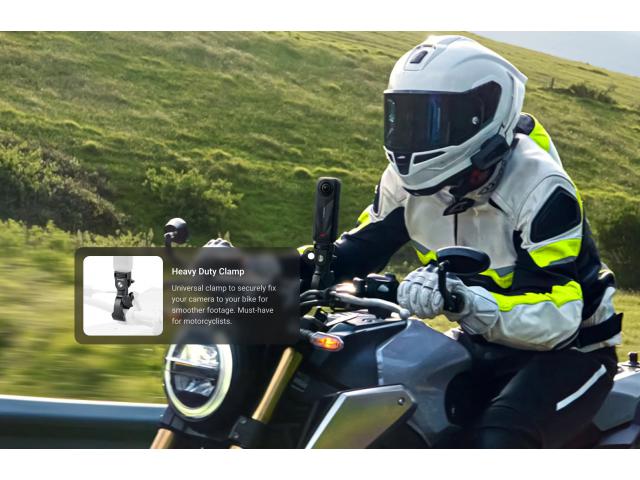 - Paket za motocikl s više prikaza uključuje 1x Insta360 X5, 1x poklopac objektiva, 1x nevidljivi selfie štapić Action i 1x izdržljivu stezaljku.