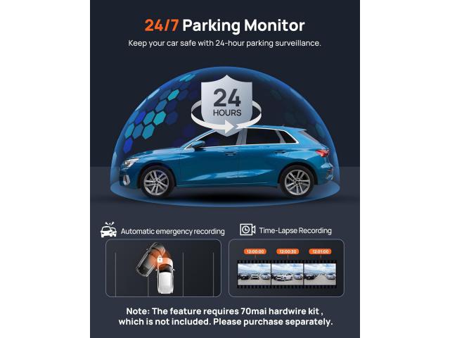 Kamera također podržava 24-satno praćenje parkiranja, gdje G-senzor otkriva iznenadne sudare ili pokrete i automatski bilježi događaj kako bi zaštitio vaše vozilo čak i kada ste odsutni. Kako bi mogli koristiti navedenu funkciju, potrebno je kameru spojiti na konstantan izvor napajanja uz UP03 ili 4G Hardware kit.