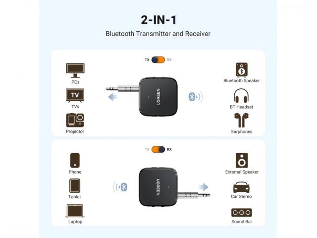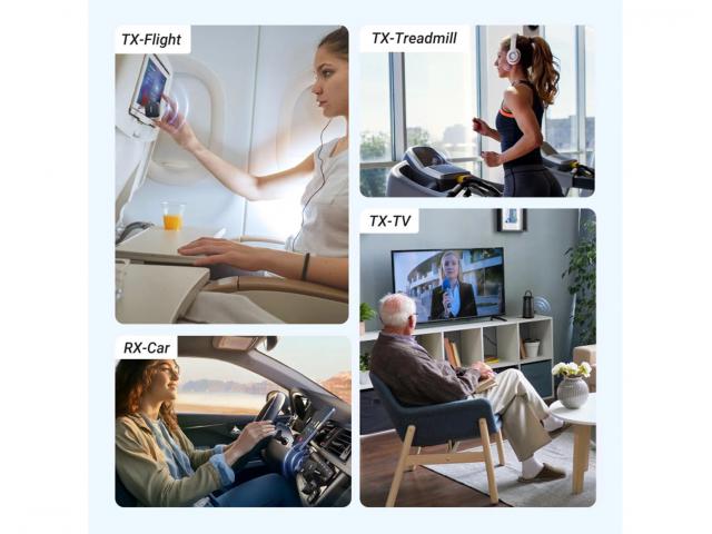 U TX načinu rada, lako je pretvoriti TV, računalo ili opremu za teretanu/let u Bluetooth odašiljač. U RX načinu rada, može strujati glazbu ili telefonske pozive na automobilske/zvučničke/kućne stereo sustave koji nemaju Bluetooth.