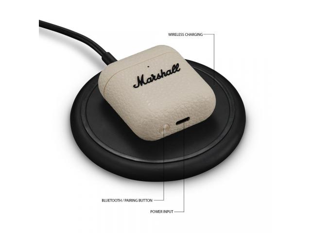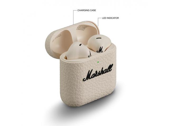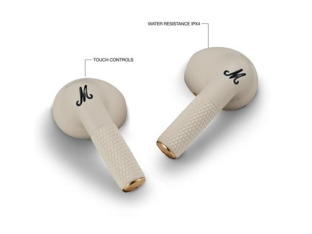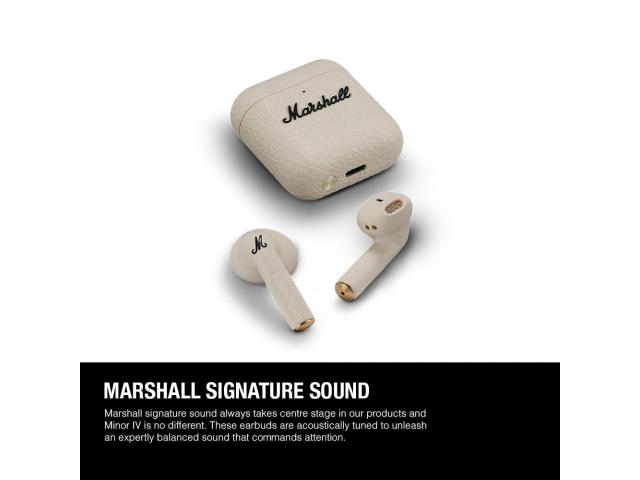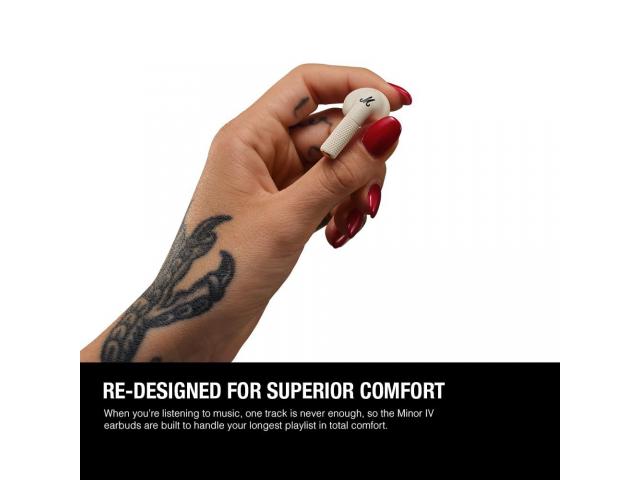 Marshallov prepoznatljivi zvuk uvijek je u središtu pozornosti, a Minor IV nije iznimka. Ove slušalice su akustički podešene kako bi oslobodile stručno uravnotežen zvuk koji privlači pažnju. Kada trebate predah od glazbe, njihova vrhunska kvaliteta poziva znači da uvijek možete podići telefon bez ikakvih ometanja. Ove slušalice mogu samostalno bežično svirati do 7 sati. Uparene s prijenosnom kutijicom za punjenje mogu vas napajati ukupno 30+ sati . Jednostavno umetnite slušalice u kutijicu kada želite dodatno pojačanje. Kako bi sesija trajala, Minor IV ima redizajnirane ušne kapice i drške, pod kutom kako bi se stvorilo točnije prileganje unutar ušnog kanala. Također su vodootporne tako da glazba ne mora prestati kada pada kiša. Minor IV dolazi sa slušalicama osjetljivim na dodir , tako da možete koristiti bilo koju od njih za upravljanje glazbom i telefonskim pozivima . Uklanjanje i umetanje slušalice također pokreće funkciju automatske pauze i reprodukcije. Značajka očuvanja baterije u aplikaciji omogućuje vam smanjenje brzog starenja baterije. Preuzimanjem bežičnih (OTA) ažuriranja vaše slušalice uvijek imaju najnoviji softver kako biste ih mogli dulje koristiti.