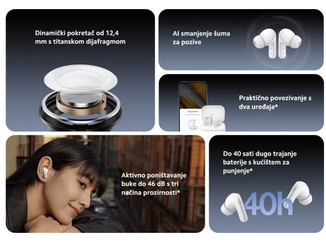 12,4 mm veliki dinamički driver s membranom od titana omogućuje veće područje vibracija i dublje otkucaje, dok kruta i tvrda membrana obložena titanom nudi čistije visoke tonove. Slušajte žicu kako škripi i diše između fraza; profesionalna akustika oživljava glazbu. Nezavisna zvučna komora Redmi Buds 5 osigurava izvrstan dinamički frekvencijski odziv i konzistentnost zvuka, stvarajući realističnije i sveobuhvatnije iskustvo s različitim slojevima zvukova visoke, srednje i niske frekvencije. Optimiziran korištenjem podatkovnog modeliranja tisuća modela ušnih kanala, Redmi Buds 5 kombiniraju stabilno pristajanje s udobnošću. Uz unutarnju i vanjsku raspodjelu težine 65:35, Redmi Buds 5 teži prema uhu kako bi bolje pristajale. Futrola za punjenje Redmi Buds 5 ima dizajn poput oblaka koji je nježan i kompaktan. Pulsna svjetla na kućištu sastavljena su od pet malih kuglica koje emitiraju meku i prirodnu svjetlost. Sjajne ukrasne trake obrađene nano premazom doprinose eleganciji Redmi Buds 5. Redmi Buds 5 usvaja dvokanalni algoritam umjetne inteligencije koji smo sami razvili, što mu omogućuje otpornost na buku koju stvara vjetar od 6 m/s*. 2 mikrofona zajedno učinkovito izvlače glasovne zvukove s preciznošću i filtriraju vanjsku buku, tako da se čini kao da razgovarate s osobom na liniji licem u lice. Lako prilagodite audio balans sa 4 EQ postavke za postizanje zvuka za kojim žudite.