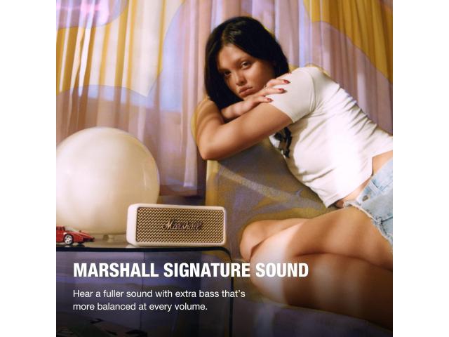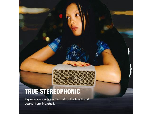 Emberton III ima više basa od svog prethodnika. Dynamic Loudness podešava tonski balans dok mijenjate glasnoću. Otkrijte bogat, pun zvuk koji vas nikada neće iznevjeriti. Dostupan isključivo na Marshall proizvodima, True Stereophonic je jedinstveni oblik višesmjernog zvuka . To je apsolutni 360° zvuk , gdje vas glazba pronalazi. Istina je, nisu svi zvučnici jednaki. Do 32h slušanja glabe je više od cijelog dana slušanja s jednim punjenjem. Dovoljno vremena za reprodukciju cijele diskografije. Kada vam se baterija isprazni, samo priključite zvučnik i napunite ga za 2 sata.