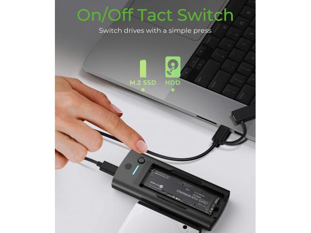 Jednostavno prebacivanje između SSD-a i HDD-a jednostavnim pritiskom na taktilni prekidač koji se nalazi na prednjoj strani. Ova značajka omogućuje brze promjene sučelja pogona bez muke.