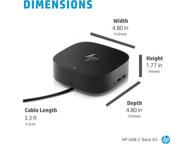 HP USB-C Dock G5, HDMI 1, Audio In/Out 1, USB 3.0 4, USB Type-C 1, RJ45 1, Display Port 2, AC power adapter,USB-C cable,Standard lock slot