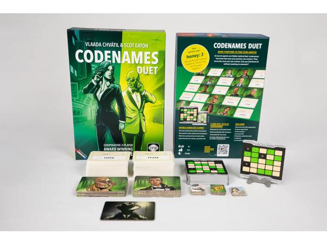 Igra sada dolazi s ažuriranim popisom riječi, prekrasnim ilustracijama, potpuno novim umetkom koji održava igru uredno organiziranom te pojednostavljenim pravilima koja olakšavaju učenje i podučavanje igre. U Codenames: Duet više se ne natječete već se udružujete s drugim operativcem (ili operativcima u grupnoj igri) za uzbudljivo kooperativno iskustvo. Misija? Zajedničkim snagama pronaći sve svoje tajne agente skrivene među mrežom misterioznih kodnih imena. Zavrzlama? Svaki od vas vidi samo dio ključa i nitko nema potpunu sliku. Codenames: Duet savršen je za igranje u dvoje, ali se može igrati i s više prijatelja ako želite manje natjecateljsko iskustvo nego u osnovnoj igri Codenames.