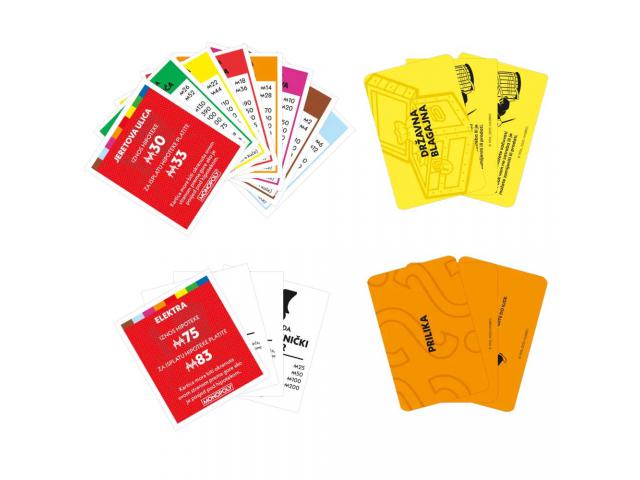 ploča za igru, 8 žetona, 28 kartica s vlasničkim listovima, 16 kartica šanse, 16 kartica državne blagajne, 32 kuće, 12 hotela, 2 kockice, 1 pakiranje Monopoly novca, pravila igre.