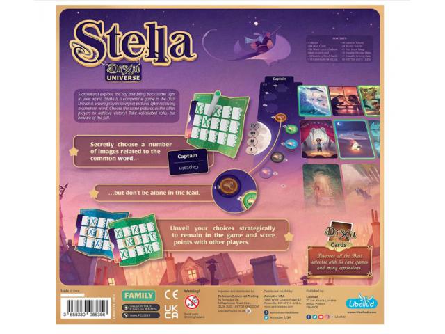 Stella je natjecateljska igra u Dixit svemiru. U svakom krugu igrači tumače Dixit karte na ploči nakon što dobiju uobičajenu ključnu riječ. Svaki igrač promatra Dixit karte i potajno povezuje te karte s ključnom riječi, označavajući na svojim izbrisivim osobnim pločama karte koje odabere. Odabir istih karata kao i ostali igrači omogućuje vam da osvojite više bodova. S druge strane, odabir kartice koju nitko drugi ne bira može vas skupo koštati.