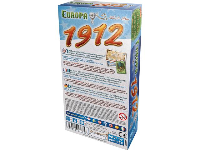 Proširenje Ticket to Ride Europa 1912 za seriju Ticket to Ride uključuje 101 ulaznicu za odredište - 46 originalnih ulaznica, plus 55 novih koje omogućuju 3 nove varijante karte Ticket to Ride Europe: Europe Expanded, koja dodaje 19 novih ruta na original 46; Veliki gradovi Europe, s ulaznicama za 9 velikih europskih gradova; i Mega Europe, koja koristi sve nove rute kao i 46 originalnih odredišnih karata.