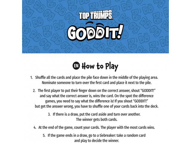 Shvati igru, riješi zagonetku i vikni "Goddit!" da bi pobijedio/pobijedila! Igra uključuje 55 različitih zagonetki u 5 različitih igara: Glupi niz, Labirint, Uoči razliku, Slagalica i Tri iste vrste! Utrkuj se protiv svojih protivnika kako bi raspetljao/raspetljala zagonetke i točno identificirao/la rješenje kako bi osvojio/la kartu, a kada ga dobiješ - vikni "Goddit!".