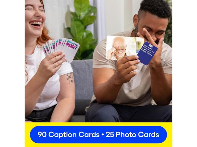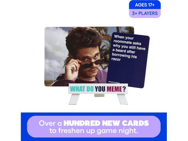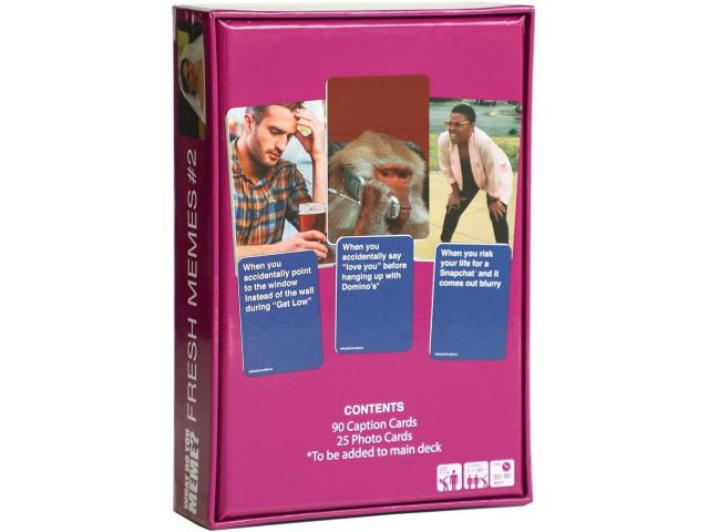Ako si sa svojom ekipom više nego jednom zaigrao What do you meme? društvenu igru, vjerojatnost da ste prošli sve kartice je velika. Stoga ti je u ovom What Do You Meme?, društvena igra koja je zapalila internet dobila je novu nadogradnju koja će pružiti još više zabave i smijeha! Ukoliko ste učestalim igranjem prošli sve kartice originalne igre uzduž i poprijeko, onda će vam ovaj dodatak igri donijeti prijeko potrebno osvježenje. U pakiranju se nalazi 90 kartica s novim natpisima te 25 kartica s fotografijama. Zbog osjetljivog sadržaja na pojedinim karticama, ova društvena igra namijenjena je osobama starijim od 18 godina.