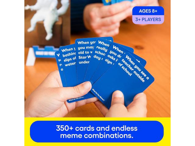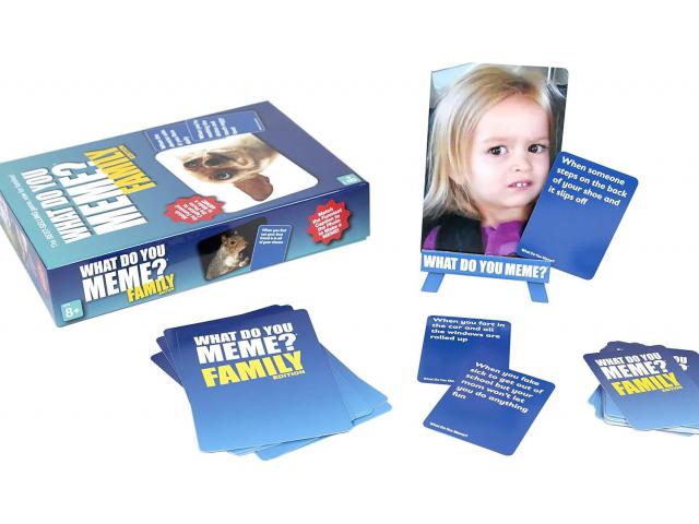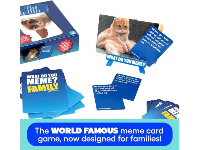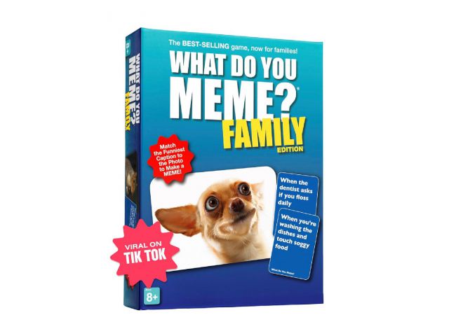 What Do You Meme?, društvena igra koja je zapalila internet dobila je novu nadogradnju koja će pružiti još više zabave i smijeha! Originalna igra pročišćena je od memeova koji su sadržajem bili isključivo za odrasle pa u ovoj varijanti može uživati cijela obitelj. O pobijedi odlučuje sudac, pravedno i s razumom naravno, kojeg igrači biraju prilikom svakog novog kruga. U pakiranju se nalazi 300 kartica s natpisima i 65 kartica s fotografijama. Osim smijeha i zabave, ova društvena igra idealna je izbor za obitelji koje zajednički žele testirati izraze na engleskom jeziku koji su sastavni dio današnje pop kulture.