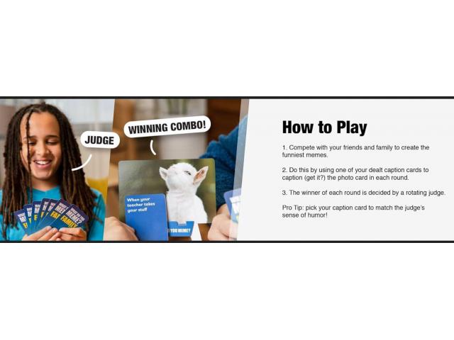 - Kako igrati: Natječite se sa svojim prijateljima i obitelji u stvaranju najsmješnijih memeova. Učinite to korištenjem jedne od svojih podijeljenih kartica s naslovom za naslov (dobijte?) foto karticu u svakoj rundi.