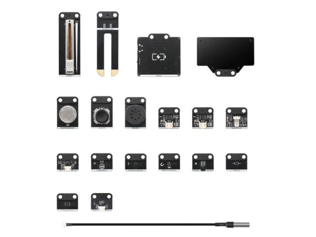 MakeBlock AI & IoT Scientist dodatni paket sadrži 18 mBuild elektroničkih modula i 7 paketa dodatne opreme, uključujući zvučnik, motor, servo, LED traku, LED prsten, LED matricu, vodenu pumpu, senzor dometa, klizač, senzor svjetla, senzor vlažnosti tla, upravljačku palicu, senzor temperature, MQ2 senzor plina, senzor vlage, senzor plamena, magnetski senzor, modul za proširenje i punjivu litijevu bateriju.