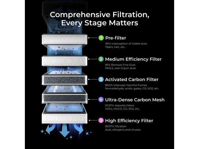 - Ultragusta ugljična mreža i filter s aktivnim ugljenom učinkovito apsorbiraju štetne plinove i mirise, osiguravajući svjež i zdrav zrak u zatvorenom prostoru.