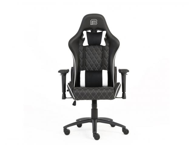 Gaming stolica s potpornim jastučićima; Nasloni za ruke: 4D; Materijal pokrova stolice: PU koža + tkanina; Materijal unutrašnjosti: Hladno prešana pjena; Dimenzije (cm): 72 x 49 x 126 - 136; Tip mehanizma: Leptir; Tip postolja: 350mm metalna baza; Zračni mehanizam podizanja: Klasa 4 / 100mm; Veličina i materijal kotačića: 60mm PU; Jastuk za glavu i leđa od tkanine; Nosivost: 150kg; Širina naslona za ramena: 54cm; Visina naslona: 83cm; Veličina sjedala: 55cm Š x 52cm D; Visina sjedala: 47-57cm; Zaključavanje kuta nagiba 15°; Zaključavanje nagiba; Podešavanje nagiba 150°; Boja pokrova stolice: Crno/Bijela; Materijal okvira: Željezo; Boja okvira: Crna; Potrebna montaža