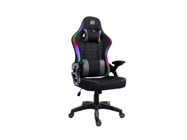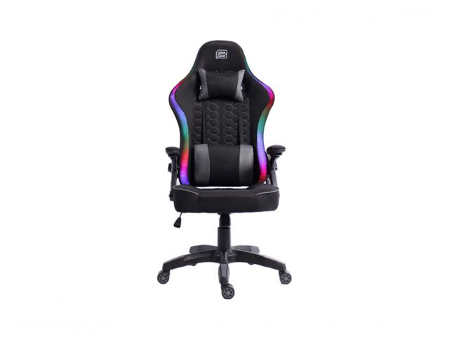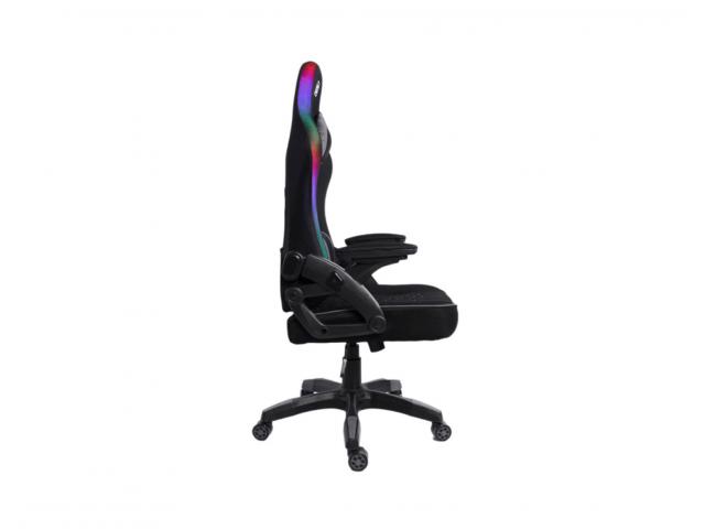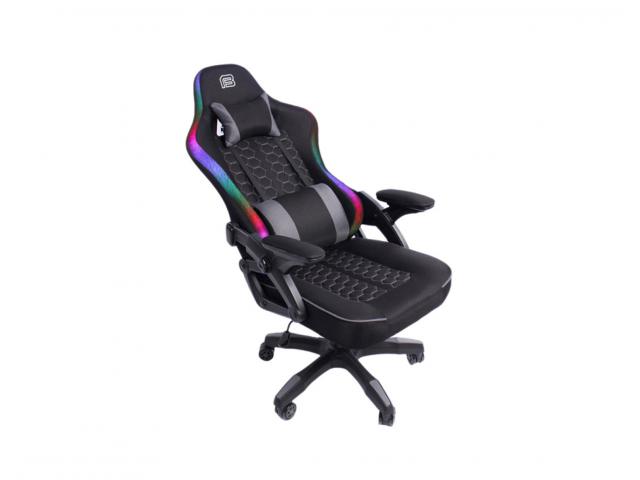 RGB Gaming stolica s potpornim jastučićima; Nasloni za ruke: 2D; Materijal pokrova stolice: PU koža; Materijal unutrašnjosti: Hladno prešana pjena; Dimenzije (cm): 67.5 x 51.5 x 116 - 126; RGB rubno osvjetljenje; Napajanje osvjetljenja: 5V uz USB konektor; Tip mehanizma: 17# Leptir; Tip postolja: 320mm plastična baza; Zračni mehanizam podizanja: Klasa 3 / 100mm; Veličina i materijal kotačića: 60mm PU; Jastuk za glavu i leđa od tkanine; Nosivost: 130kg; Širina naslona za ramena: 56.5cm; Visina naslona: 79.5cm; Veličina sjedala: 48cm Š x 51cm D; Visina sjedala: 44.5/54.5cm; Zaključavanje kuta nagiba 10°; Zaključavanje nagiba; Podešavanje nagiba 135°; Boja pokrova stolice: Crna; Materijal okvira: Željezo; Boja okvira: Crna; Potrebna montaža