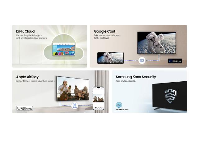 Pomoću višekodnog daljinskog upravljača, Samsungovi hotelski televizori sprječavaju smetnje od susjednih daljinskih upravljača ili ekrana, osiguravajući besprijekorno audiovizualno iskustvo za korisnike. Samsung Knox Security osigurava televizore blokiranjem neovlaštenih zlonamjernih aplikacija ili pristupa phishing stranicama i osiguravanjem povezanih IoT uređaja. Kao rezultat toga, štiti osjetljive podatke gostiju poput PIN-ova i lozinki putem više slojeva softvera i hardvera.