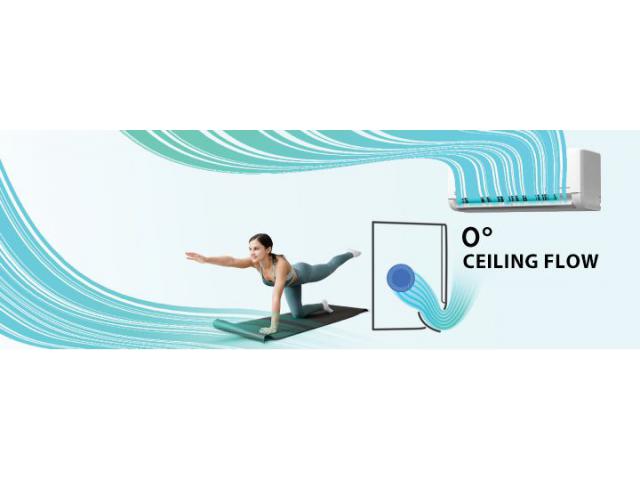 Midein AI ECOMASTER donosi naprednu umjetnu inteligenciju unutar klimatizacije, opsežno uvježbanu na milijardama podataka kako bi pružila vrhunsko upravljanje energijom čak i bez pristupa internetu. Brža i preciznija kontrola, sada omogućuje uštedu energije i još veću udobnost na način da dinamički predviđa promjene unutarnjeg toplinskog opterećenja i uvjeta u okolini. 180° rotirajući usmjerivač zraka omogućava neograničeno dinamičko zakretanje za iznenađujuću udobnost što omogućava brzo hlađenje i grijanje uz preciznu, nježnu regulaciju i što je najvažnije bez direktnog puhanja. Hlađenje bez izravnog udara zraka omogućava da se ohlađeni ili zagrijani zrak tiho se spušta sa stropa ili te vas obavija vas ugodnim, blagim osjećajem. Usmjereni izlaz zraka automatski se pomiče vodoravno i okomito, usmjeravajući ugodan i rashlađen zrak tako da ispuni svaki kut prostorije.