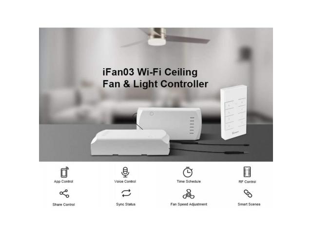 U paketu s RM433 RF daljinskim upravljačem, koji se može pohraniti na držač za jednostavno korištenje (nosač nije uključen, prodaje se zasebno), koji vam omogućuje uključivanje/isključivanje ventilatora i svjetla te podešavanje brzine ventilatora u 3 zupčanici. 2. Imajte na umu da iFan03 nema DIY način rada, pa se firmware ne može dodijeliti korisnicima