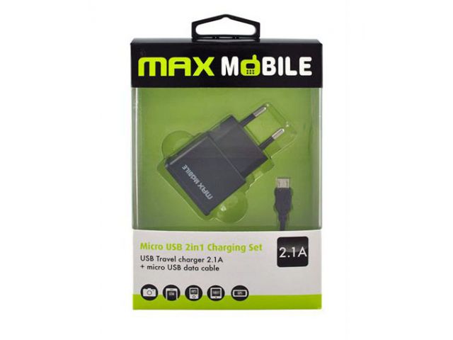 Kućni punjač MAXMOBILE 2 u 1, micro USB, 2100 mAh, crni, univerzalni