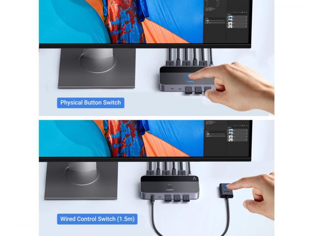 Zahvaljujući gumbu na kućištu i daljinskom upravljaču, Ugreen CM664 prekidač omogućuje vam besprijekorno prebacivanje između računala. Ovo rješenje nije samo praktično, već omogućuje i brzo i intuitivno upravljanje vezom, što značajno olakšava rad.