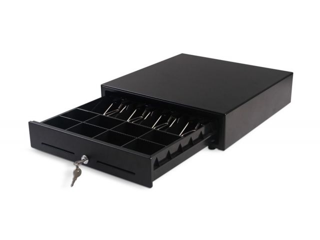 Ladica za novac MS 410, 4 novčanice/ 8 kovanice, Epson standard RjJ11 ,RJ12, 410(Š)x420(D)x100(V), metalna konstrukcija, 7,6kg, 6V/9 V/12/24Vcrna