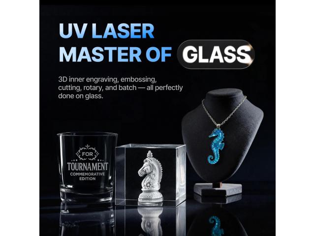 F2 Ultra UV gravira mikroskopske detalje direktno na staklu bez pripreme ili čišćenja. Podržava utiskivanje, rezanje i rotacijsko graviranje , otključavajući neograničene mogućnosti i podižući vašu staklenu umjetnost na višu razinu. Visoka energija fotona UV lasera prekida molekularne veze uz minimalnu toplinu - bez opeklina, ugljenisanja, oštećenja. Nije potrebno prethodno premazivanje ili poliranje, samo čisti, precizni rezultati. To je snaga hladne obrade.