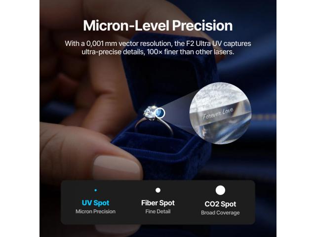 S UV točkom manjom od 10 µm - preko 100× manjom od CO2 - F2 Ultra UV pruža pravu preciznost na razini mikrona. Njegov optimizirani algoritam za vektorsko prilagođavanje s rezolucijom od 0,001 mm oživljava svaki detalj sa zapanjujućom jasnoćom. Kao ultimativni laser za gotovo sve materijale , F2 Ultra UV čini ono što drugi ne mogu: hvata fine detalje čak i na gotovo svim akrilnim, kristalnim, keramičkim, silikonskim, plastičnim i drugim materijalima, nudeći neusporedivu kompatibilnost s materijalima.