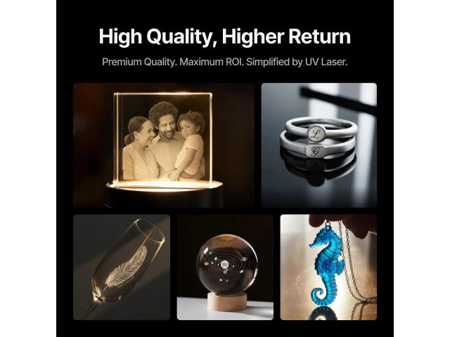 UV laseri imaju kratku valnu duljinu i fotone visoke energije koji izravno prekidaju molekularne veze s vrlo malo topline. Ova „hladna obrada“ pruža puno veću gustoću energije i preciznost od tradicionalnih lasera na bazi topline. Čak i za zahtjevne zadatke poput 3D graviranja unutar stakla , F2 Ultra UV obično koristi samo oko 60% svoje snage, ostavljajući mnogo prostora za performanse. Omogućuje trajno 3D unutarnje graviranje, a površina ostaje potpuno netaknuta. Od staklenih blokova do kristalnih kugli i šire, svaki oblik se pretvara u zapanjujuću, jedinstvenu kreaciju s povećanom umjetničkom i kolekcionarskom vrijednošću. Brzina obrade je najbolja u klasi, čak 15.000 mm/s.