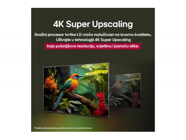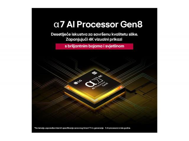 Značajna poboljšanja radne učinkovitosti, brža obrada procesora alpha 7 AI Processor Gen8 sada omogućuje kvalitetu slike u 4K s puno boljom oštrinom i dubinom slike. Živopisne HDR10 boje i osvjetljenje podižu rezoluciju zaslona na nove razine. Doživite poboljšanu kvalitetu slike s jačim kontrastom. Snažni procesor tvrtke LG pojačava rezoluciju do izvorne kvalitete. Uživajte u 4K Super Upscaling koji poboljšava rezoluciju, osvjetljenje i jasnoću. Personalizirane slike s 1,6 milijardi mogućnosti zahvaljujući pomoćniku za slike AI Picture Wizard. AI robot za čavrljanje u opciji AI Chatbot aktivno će rješavati i pomoći vam s vašim upitima. Jednostavno razgovarajte sa svojim televizorom jer on može klasificirati vaše namjere i odgovoriti u skladu s njima.