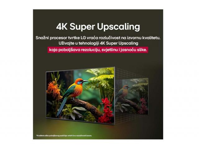 Novi procesor donosi značajna poboljšanja radne učinkovitosti, brža obrada procesora alpha 7 AI Processor Gen8 sada omogućuje kvalitetu slike u 4K s puno boljom oštrinom i dubinom slike. Gledajte sadržaj u rezoluciji od 4K s točnim izražajnim bojama i jasnim pojedinostima, što svaku scenu čini vizualno upečatljivom i ugodnom za gledanje. Snažni procesor tvrtke LG pojačava rezoluciju do izvorne kvalitete. Uživajte u 4K Super Upscaling koji poboljšava rezoluciju, osvjetljenje i jasnoću. Precizan ispravak tona AI Clear Sound poboljšava jasnoću zvuka za izvanredni užitak slušanja. Uživajte u filmu kako je to zamislio redatelj pomoću načina rada FILMMAKER MODE koji se prilagođava okruženju kako bi se očuvala slika i bila što bliže izvornom obliku.