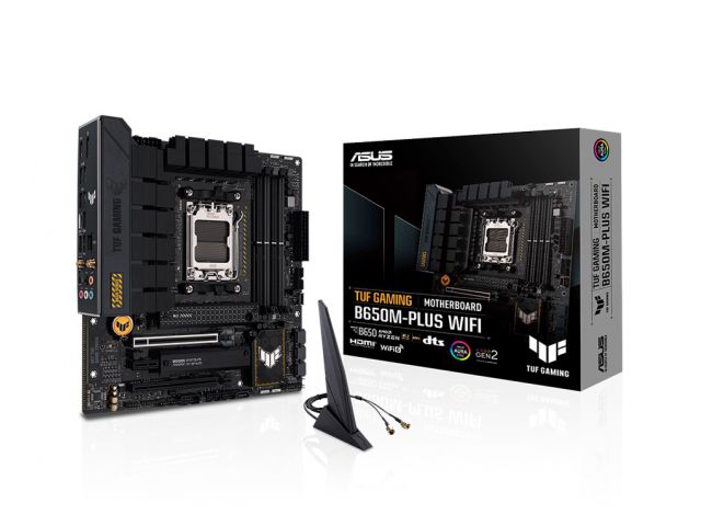 ASUS TUF GAMING B650M-PLUS WIFI takes all the essential elements of the latest AMD Ryzen 7000-series processors and combines them with game-ready features and proven durability. Engineered with military-grade components, an upgraded power solution and a comprehensive cooling system, this motherboard goes beyond expectations with rock-solid and stable performance for marathon gaming. TUF GAMING motherboards also undergo rigorous endurance testing to ensure that they can handle conditions where others may fail. Aesthetically, this model incorporates rugged off-black and geometric design elements to reflect the dependability and stability that defines the TUF GAMING series.