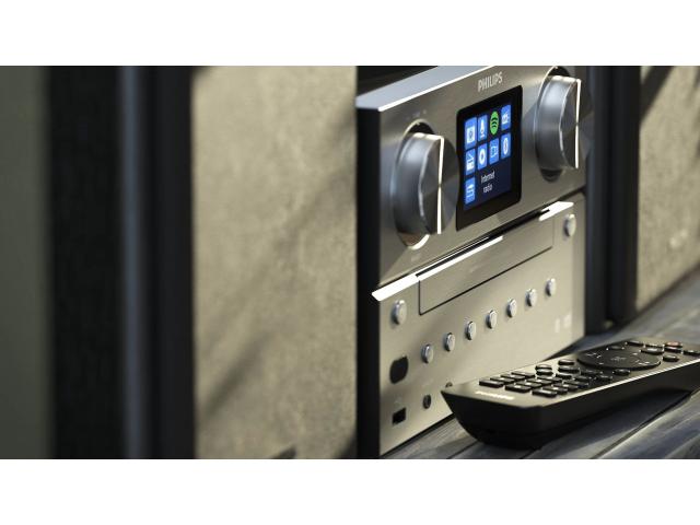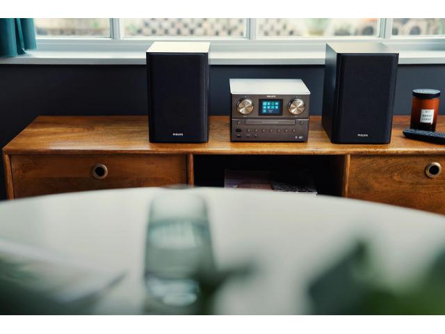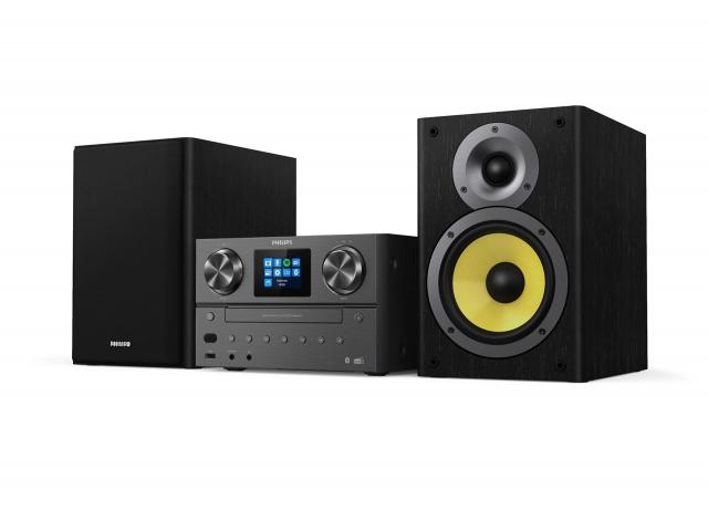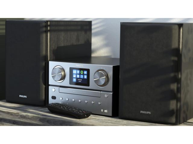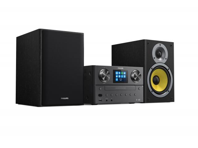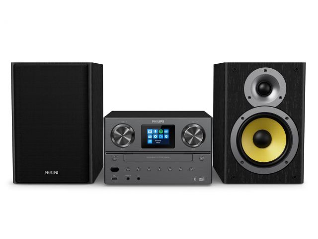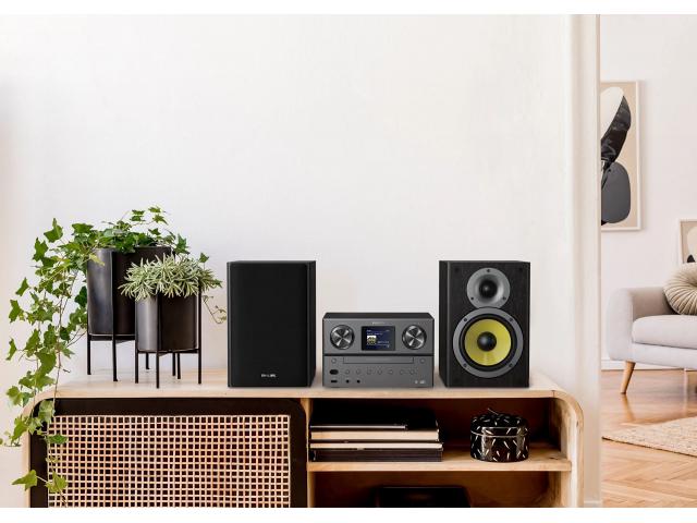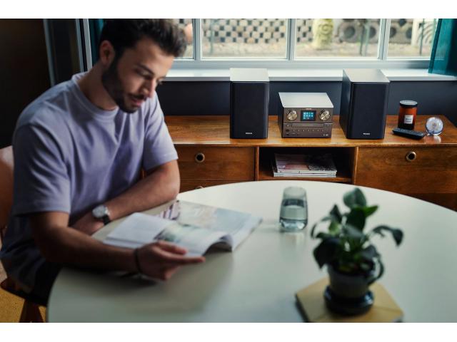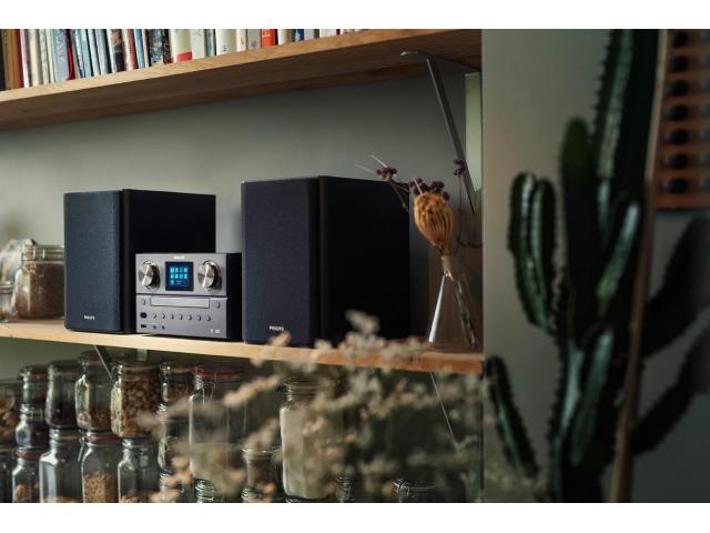 Ispunite svoju prostoriju zvukovima koje volite. Internetski radio, Spotify Connect, Bluetooth, i CD reproduktor, ovaj atraktivni mikro sustav reproducira sve. Također možete slušati DAB+ ili FM radio – sve s moćnim zvukom od 100 W. Od klasičnih snimki do najnovijih podcasta. Sa Spotify Connect putem veze Wi-Fi možete usmjeravati najbolji Spotify signal. Također možete usmjeravati popise za reprodukcije i druge sadržaje putem veze Bluetooth, reproducirati CD medije ili se povezati s drugim izvorima putem audio ulaza ili priključka USB. Internetski radio vaš je pristup tisućama globalnih postaja koje emitiraju sve zamislive sadržaje. Digitalni prijemnik omogućuje kristalno jasan prijem, a također možete memorirati omiljene internetske, DAB+ ili FM postaje. Ovi zvučnici za police za knjige daju odličan zvuk s čistim visokim tonovima zahvaljujući kupolastim visokotoncima te snažan bas s 5,25-inčnih niskotonaca i otvora bass reflex. Maksimalna izlazna snaga od 100 W osigurava bogat zvuk u svim prostorijama. Savršeno za salone i otvorene prostore. Matirana centralna jedinica i kutije zvučnika podsjećaju na dizajn hi-fi komponenti. Na preglednom zaslonu u boji prikazuje se izvor postaje te omotnica albuma i informacije o pjesmi. Teksturirani regulatori omogućuju upravljanje glasnoćom, odabir izvora i podešavanje. Hip-hop ili zbor, simfonija ili rock opera? Bez obzira što volite, funkcija digitalne kontrole zvuka Digital Sound Control ovog mikro sustava omogućuje veće uživanje u zvuku. Birajte između memoriranih stilova glazbe osmišljenih za najbolju reprodukciju vaše glazbe.