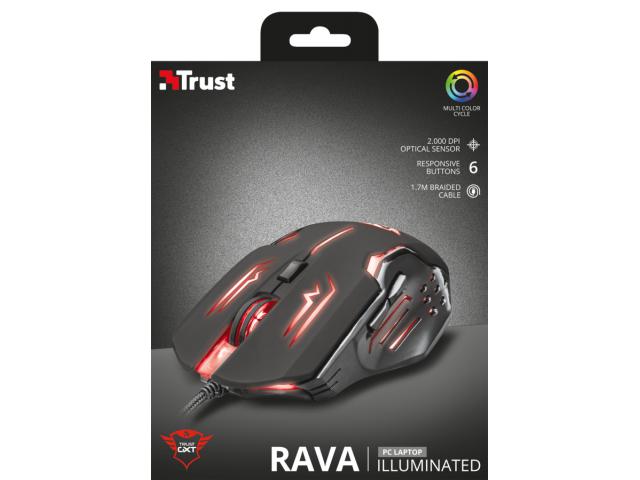 Miš TRUST gaming Rava GXT108 je pravi izbor za vas ako želite ući u svijet profi gaminga, opremljen je s čak 6 tipki i 16G ubrzanjem. Izmjenjiva rezolucija od 600, 1200, 1600, 2000 DPI prilagodit će se svakoj vašoj potrebi i pružiti još veće zadovoljstvo za vrijeme igranja igrica i slično. Ovaj optički miš je osvjetljen LED svjetlom i specifičnog je dizajna.