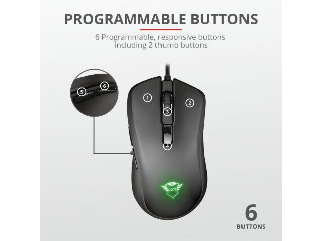 Advanced optical sensor with 6400 DPI resolutionFully adjustable RGB lighting with multiple effects6 Programmable, responsive buttons including 2 thumb buttonsDPI select button with LED indicationAdvanced software for programming buttons, macros and light effectsBraided cable (1.8m)