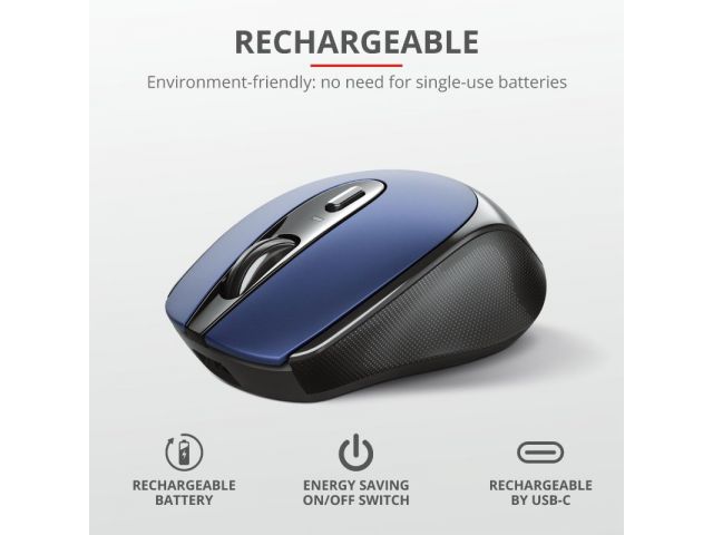 Connect the mouse wirelessly to PC or laptopEnvironment-friendly, no need for batteries due to built-in rechargeable batteryUSB micro-receiver, storable inside the mouseCompact size suitable for left and right-handed useRubber finish for a modern look and comfortable feel4 Buttons including a DPI speed button to change cursor speed (800-1200-1600 dpi)USB-C port to recharge the battery (cable included)Energy saving on / off switch