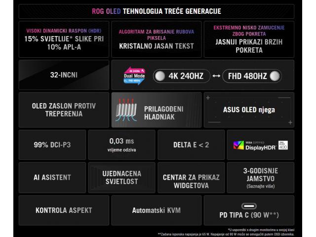 ROG Swift OLED PG32UCDP je 32-inčni WOLED gaming monitor s revolucionarnom značajkom dvostrukog načina rada koja vam omogućuje prebacivanje između 4K @ 240 Hz ili FHD @ 480 Hz slike. ROG OLED tehnologija treće generacije pruža žive boje, najdublje crne nijanse i najsvjetlije istaknute dijelove. Vrijeme odziva od 0,03 ms od sive do sive (GTG) osigurava akciju bez zamućenja, čak i tijekom intenzivnog igranja. Osim toga, novi AI Assistant poboljšava iskustvo igranja, a napredni prilagođeni hladnjak pruža iznimne performanse pasivnog hlađenja kako bi se smanjio rizik od izgaranja, pomažući u osiguravanju dugotrajnosti OLED panela. ROG-ekskluzivna OLED Anti-Flicker tehnologija nudi tri raspona brzine osvježavanja (Visoka / Srednja / Isključena) kako bi se smanjilo treperenje tijekom fluktuacija brzine osvježavanja i održalo impresivno iskustvo igranja. Novi AI Assistant u PG32UCDP uključuje AI Visual*, AI Crosshair, AI Shadow Boost, AI Sniper i MOBA Map Helper. Ove značajke koriste AI tehnologiju kako bi igračima pomogle da učinkovitije vježbaju i poboljšaju svoja igraća iskustva. Iznimno visok omjer kontrasta koji nudi OLED tehnologija osigurava najdublje crne nijanse i žive boje. Osim toga, nevjerojatno vrijeme odziva od sive do sive (GTG) od 0,03 ms osigurava super glatko igranje s niskom latencijom. Prilagođeni pasivni hladnjak koji se nalazi u PG32UCDP-u daje prioritet odvođenju topline. Osim toga, stražnji poklopac monitora ima gornje otvore za ventilaciju koji dodatno poboljšavaju hlađenje kako bi značajno smanjili rizik od izgaranja. ASUS OLED Care pruža pravovremene podsjetnike za čišćenje piksela, čuvar zaslona, funkciju pomicanja zaslona i još mnogo toga za zaštitu OLED panela i osiguravanje dugotrajnosti zaslona. Ako više volite igrati na manjem monitoru, PG32UCDP podržava niz omjera slike, što vam omogućuje odabir između 24,5-inčne (esports način rada) ili 27-inčne slike. Kada se aktivira, ROG-ova ekskluzivna postavka Uniform Brightness unutar OSD izbornika smanjuje vršnu svjetlinu kako bi se održale dosljedne razine za bolji pregled - čak i pri promjeni veličine jarko bijelih prozora. Također čini maratonske sesije igranja mnogo ugodnijima za oči. PG32UCDP dolazi sa AMD FreeSync™ Premium Pro technologijom i NVIDIA® G-SYNC® kompatiblnšću.