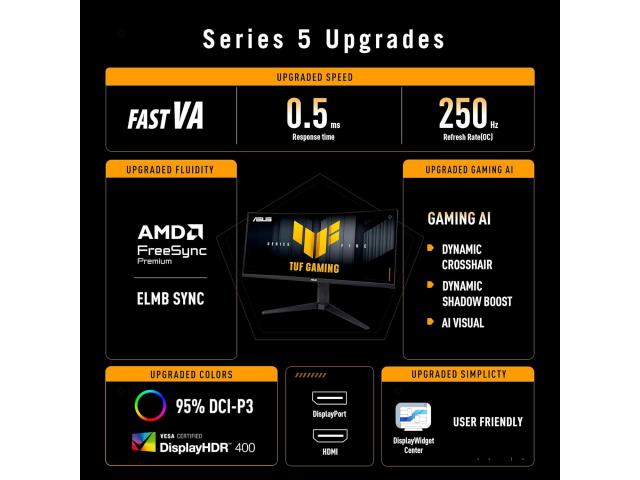TUF Gaming VG34WQML5A je 34-inčni ultra široki QHD (3440 x 1440) 1500R zakrivljeni monitor za igranje koji nudi pet naprednih nadogradnji za vrhunsko igranje. Ima munjevito brzu brzinu osvježavanja (OC) od 250 Hz i vrijeme odziva od 0,5 milisekundi. Također ima AMD FreeSync™ Premium za ultra glatku sliku, poboljšane performanse boja, pametnu TUF Gaming AI optimizaciju i jednostavno upravljanje putem DisplayWidget Centra - što vas drži ispred konkurencije. DisplayHDR™ 400 i 95% DCI-P3 omogućuju VG34WQML5A da prikaže žive boje i dublji kontrast za zapanjujuće impresivne vizualne prikaze.
