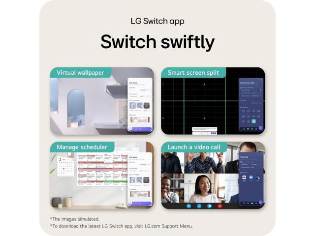 Optimizirajte monitor za posao i životne potrebe uz LG Switch aplikaciju. Podijelite zaslon na do 6 dijelova, promijenite dizajn teme ili pokrenite platformu za video pozive putem naznačenih prečaca. Stalak koji se postavlja jednim klikom olakšava postavljanje monitora i druge opreme te fleksibilnu prilagodbu nagiba, visine i zakretanja zaslona kako bi se postavio u optimalan položaj za vas.