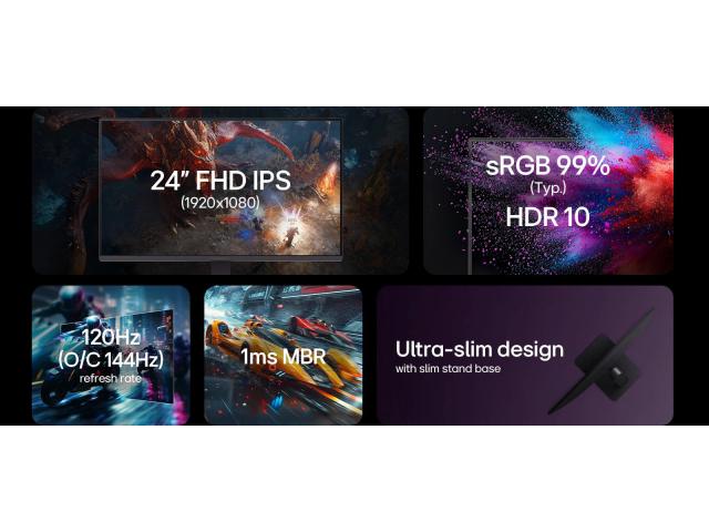 Doživite više fokusirajući se na zaslon s manje ometanja sa super tankim okvirom i minimalnom tankom bazom postolja, s dizajnom gotovo bez obruba. Stalak koji kao da lebdi naglašava čistu, bestežinsku estetiku, dok izgled zaslona koji kao da nema obruba omogućuje sveobuhvatni vizualni užitak - idealno za dvostruke postavke ili minimalističke radne prostore. Monitor podržava HDR10 i omogućuje 99 % pokrivenosti sRGB spektra te osigurava širok spektar boja koji omogućuje izrazito vjerni prikaz boja s IPS zaslonom za sveobuhvatni užitak igranja. Omogućuje igračima da dožive dramatična bojna polja onako kako su to zamislili razvojni programeri. HDR10 (visok dinamički raspon) podržava specifične razine boja i osvjetljenj te monitor osigurava do 99 % pokrivenosti palete boja DCI-P3 odlično je rješenje za iznimno realistične boje. Kako bi se postigla brzina osvježavanja od 120Hz (povećanje brzine osvježavanja 144 Hz) za fluidnu, kristalno jasnu sliku, uz minimiziranje zamućenja pokreta. Uživite se u igranje videoigara u svakom kadru.