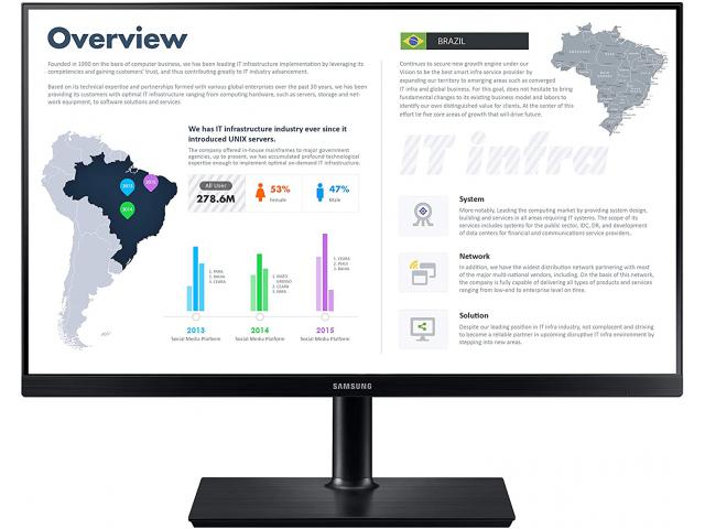 Okreće se, naginje, rotira i podešava po visini, spreman da udovolji bilo kojim potrebama upotrebe. Kako podržava VESA standard montiranja, može se s lakoćom montirati na zid ili na zasebne nosače. Njegova elegantna građa spojena sa čistim crnim dizajnom besprijekorno se stapa sa bilo kojim kancelarijskim ili privatnim prostorom.