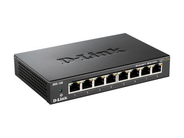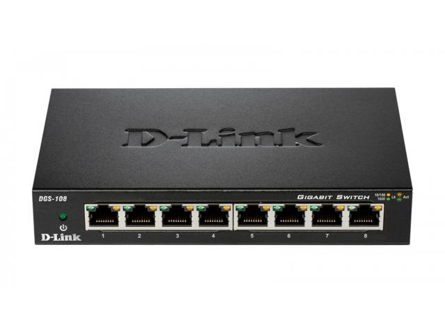 DGS-108/E je SOHO neupravljivi gigabitni preklopnik, namjenjen manjim mrežama i radnim grupama.8x10/100/1000Mbps portova posjeduju svojstvo automatske detekcije UTP kabela, omogućavajući rad uz korištenje straight-through ili crossover kabela. Uz to, preklopnik testira ispravnost kabela, signalizirajući mogući prekid. Malih je dimenzija, nečujan i jednostavan za korištenje. Napaja se vanjskim naponskim ispravljačem. Montaža može biti zidna ili stolna.Metalno kućište