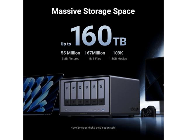 Opremljen sa šest SATA i dva M.2 NVMe pogona, NASync DXP6800 Pro ima maksimalni kapacitet pohrane do 160 TB i podržava JBOD/Basic/RAID0/RAID1/RAID5/RAID6/RAID10 RAID razine. Pohranite tisuće HD filmova, slika i dokumenata, čineći NASync biblioteku filmova, foto album i prostor za pohranu datoteka, sve u jednom.