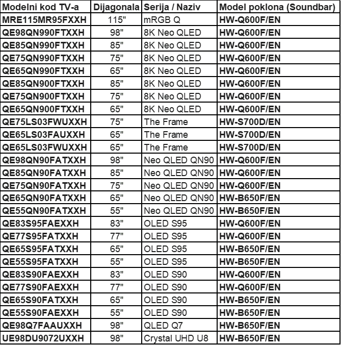 - Poklon soundbar: Modeli Q600F, B650F ili S700D (ovisno o kupljenom modelu TV-a).