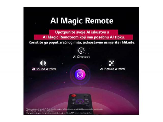 Iskoristite prednosti najnovijih značajki i softvera zahvaljujući godišnjim nadogradnjama webOS sustava. Jednostavno upravljajte televizorom pomoću daljinskog upravljača AI Magic Remote - nije potreban dodatni uređaj! Jednostavne ali snažne funkcije klikanja, povlačenja i ispuštanja čini upotrebu operativnog sustava webOS intuitivnim i jednostavnim. Vaš AI Chatbot aktivno rješava i pomaže oko vaših upita. Jednostavno se obratite televizoru jer on može klasificirati vaše namjere i odgovoriti u skladu s njima.