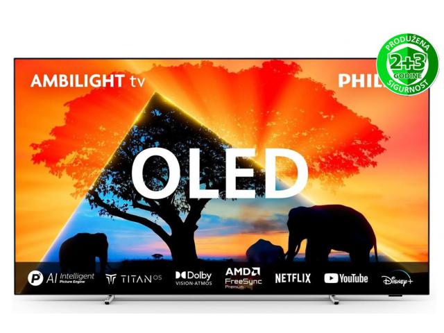 Realistična slika na vašem 4K (UHD) OLED Ambilight televizoru uvijek izgleda nevjerojatno, čak i kad se gleda pod kutom. Podržani su svi glavni HDR formati – osjetit ćete punu snagu svake scene. Ambilight čini svaki zadivljujući trenutak od kojeg vam prolaze trnci još većim. Ovaj TV ima brušene metalne nožice, a Ambilight možete upotrebljavati kao rasvjetu za ugođaj kad je zaslon isključen. Procesor Philips P5 s umjetnom inteligencijom donosi sliku koja je toliko stvarna da djeluje kao da biste mogli zakoračiti u nju. Brzo i lako pronađite što volite uz našu platformu za smart TV TITAN OS. Igrajte bez ograničenja i dopustite da vas prožme nevjerojatno realističan doživljaj koji pruža OLED! HDMI 2.1, munjevita izvorna brzina osvježavanja od 120 Hz i iznimno malo kašnjenje ulaznog signala omogućuju fluidnu, brzu igru, iznimno uglađene prirodne pokrete i odličnu grafiku. Ugrađene tehnologije Dolby Vision i Dolby Atmos osiguravaju nevjerojatan izgled i zvuk filmova, emisija i igara. Gledajte sliku kakvu je redatelj zamislio, bez razočaravajućih scena koje su pretamne da se razaznaju! Bežični kućni sustav tvrtke Philips koji ima DTS Play-Fi omogućuje vam povezivanje s kompatibilnim soundbar i bežičnim zvučnicima u vašem domu u roku od nekoliko sekundi. Besprijekorna kompatibilnost sa značajkom Matter/Control4 omogućuje vam da ovaj 4K Ambilight TV jednostavno integrirate u postojeću mrežu pametnog doma. Daljinski upravljač televizora može se upotrebljavati i za upravljanje satelitskim ili kabelskim prijemnikom ili možete aktivirati ugrađenu značajku Alexa, a TV je kompatibilan i s uređajima koji imaju omogućene pametne zvučnike Google.