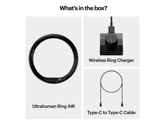 Sadržaj paketa: ULTRAHUMAN Ring AIR, standardni punjač za prsten, USB-C na USB-C kabel (1 m), uputstvo za upotrebu
