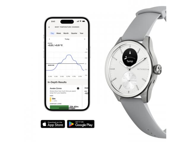 Kompatibilnost: iOS 16 i više, Android 9 i više; Withings App, Apple Health, Google Health Connect, Google Fit