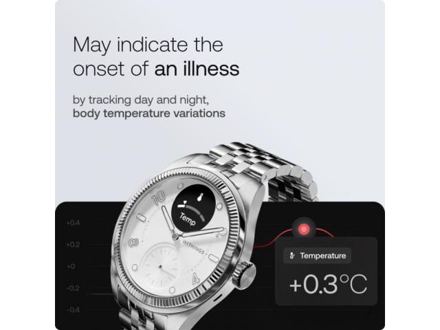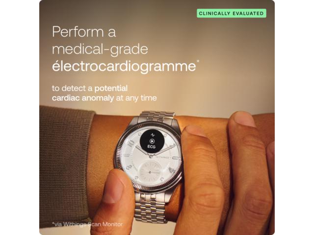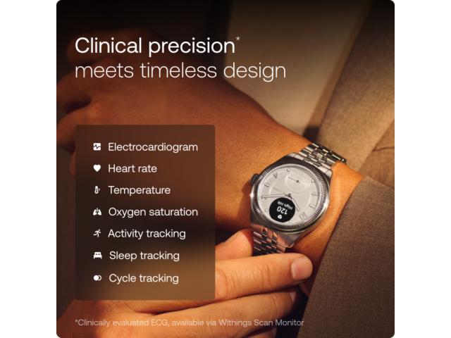 Pametni sat prati aktivnosti poput koraka, kalorija, udaljenosti i visine s povezanim GPS-om, procjenom VO2 max i prepoznavanjem preko 40 aktivnosti. Grayscale OLED zaslon visoke rezolucije osigurava jasnu čitljivost, dok kućište od nehrđajućeg čelika, safirno staklo i Super-LumiNova kazaljke pružaju premium izgled i izdržljivost. Vodootpornost do 5ATM čini ga pogodnim za plivanje. Sinkronizira se s besplatnom Withings aplikacijom za detaljne zdravstvene uvide, trendove i sigurno pohranjivanje podataka, uz kompatibilnost s Apple Health, Google Health Connect i Google Fit. Sat dolazi s FKM narukvicom i dodatnom metalnom narukvicom za prilagodbu stilu.