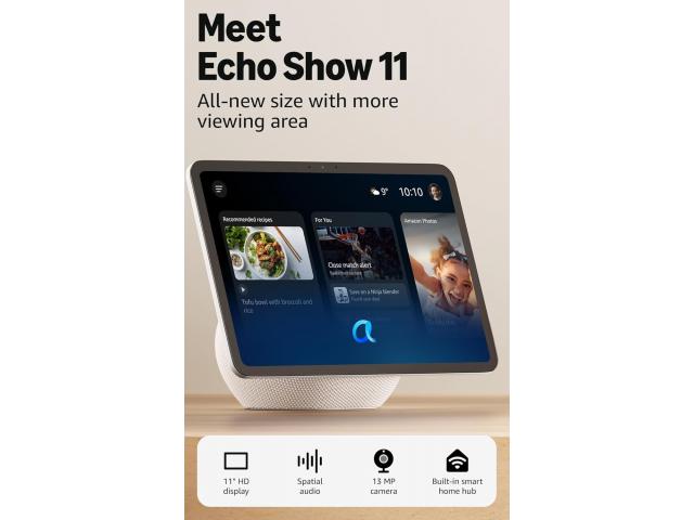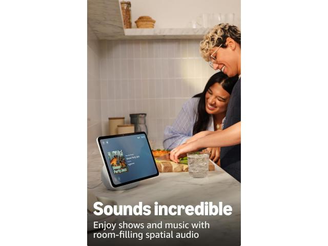 Pametni zaslon od 11" ima živopisni Full HD zaslon osjetljiv na dodir sa 60% većim područjem gledanja u odnosu na Echo Show 8 (izdanje 2025.), ugrađeno središte za pametni dom, AZ3 Pro čip za snažne performanse i Omnisense tehnologiju za poboljšano ambijentalno iskustvo. Sadržaj izgleda i zvuči nevjerojatno. Gledajte emisije na Prime Videu, Netflixu i drugima na živopisnom Full-HD 11-inčnom zaslonu i uživajte u prostornom zvuku koji ispunjava sobu, oštrijim vokalima, široj zvučnoj sceni i do 2x jačem basu u usporedbi s Echo Show 8 (izdanje iz 2023.). 11-inčni zaslon olakšava pregled recepata i kalendara, pronalaženje inspiracije za obroke i upravljanje popisima za kupovinu.